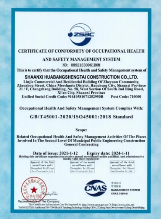 职业健康安全管理体系认证证书(英文版)