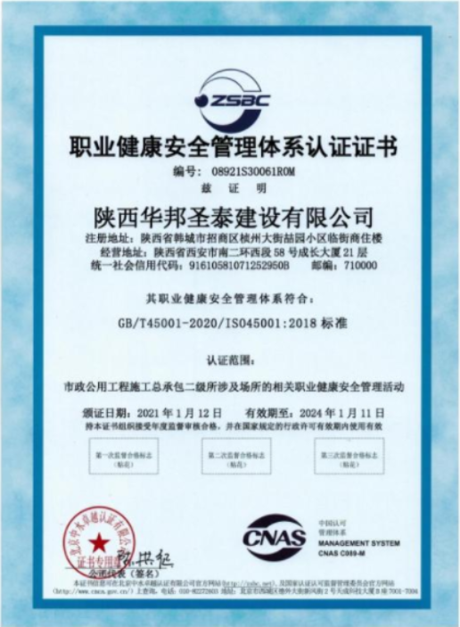 职业健康安全管理体系认证证书